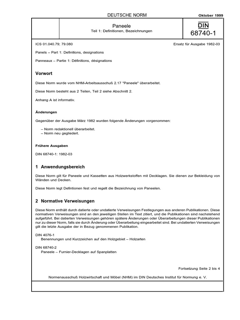 Diese Norm wurde vom NHM-Arbeitsausschu 2.17 "Paneele" berarbeitet.