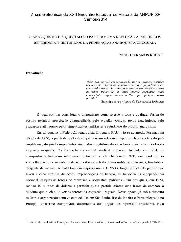 RUGAI, Ricardo Ramos. O Anarquismo Organizado: as concepes e prticas da Federao