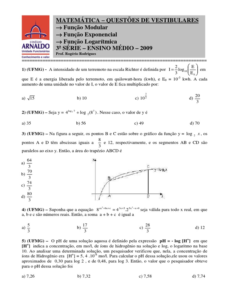 1) (UFMG) - A intensidade de um terremoto na escala Richter definida por I = log10 em