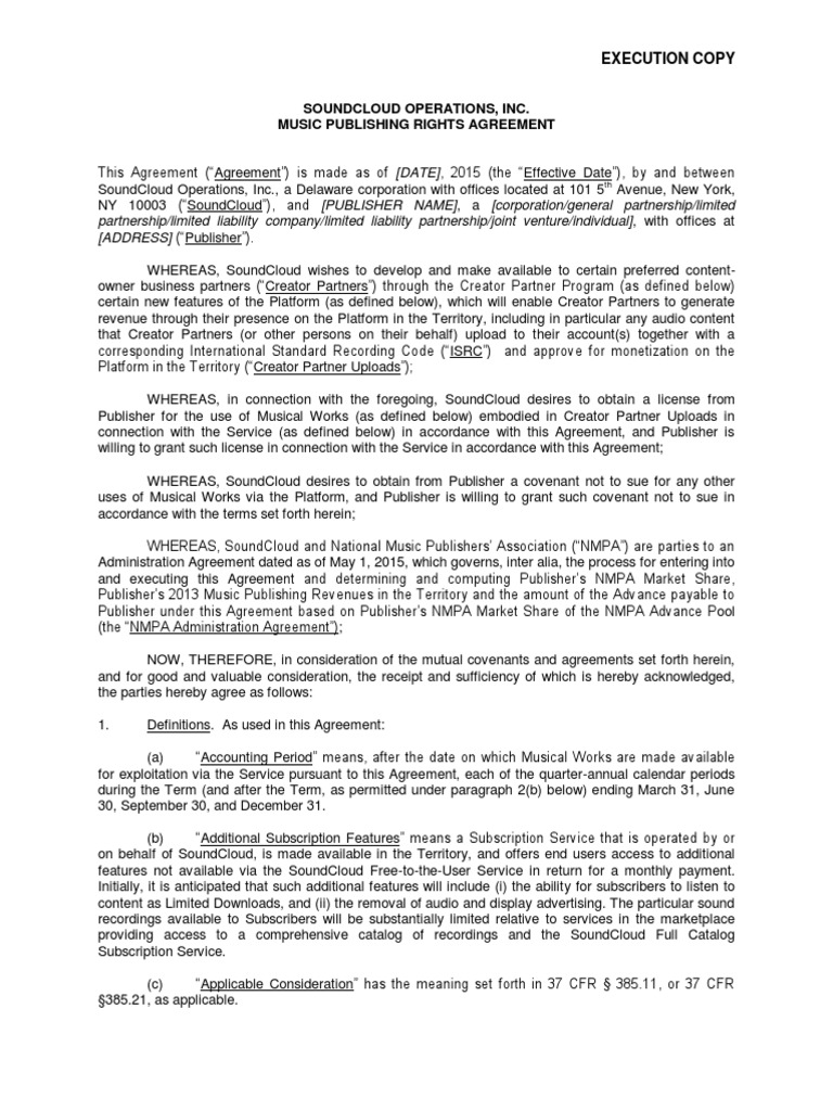 SoundCloud by NMPA pursuant to the NMPA Administration Agreement. Publisher acknowledges and