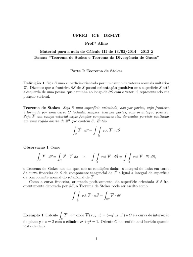 Temas: “Teorema de Stokes e Teorema da Divergˆencia de Gauss”