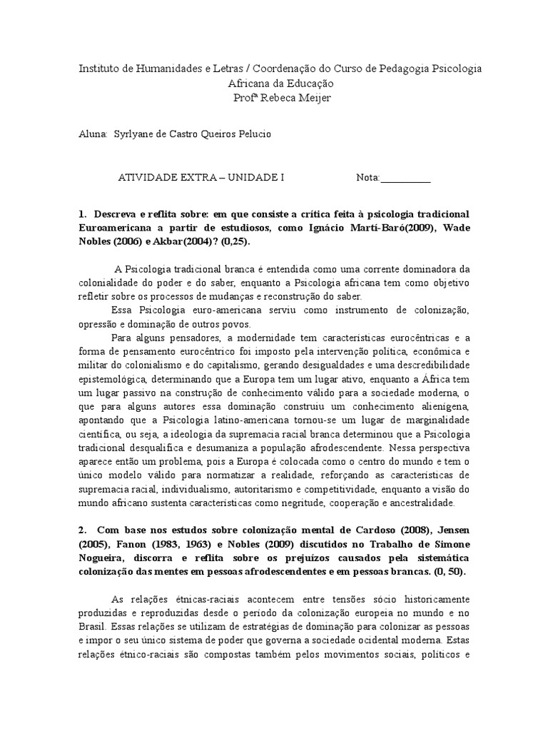 4. Comente e reflita sobre a contextualizao da psicologia Negra nos EUA. (0, 25).