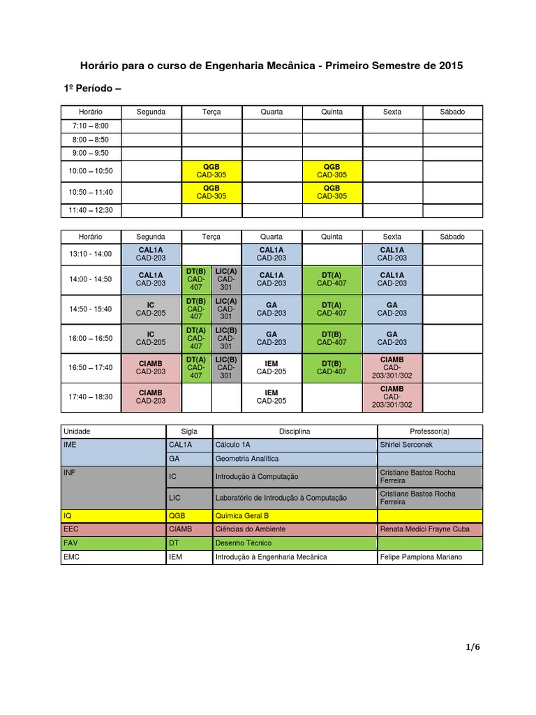 Horário para o curso de Engenharia Mecânica - Primeiro Semestre de 2015