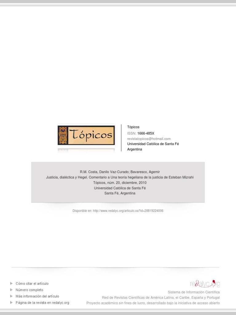 R.M. Costa, Danilo Vaz-Curado; Bavaresco, Agemir Justicia, dialéctica y Hegel. Comentario a Una teoría hegeliana de la justicia de Esteban Mizrahi Tópicos, núm. 20, diciembre, 2010 Universidad Católica de Santa Fé Santa Fé, Argentina