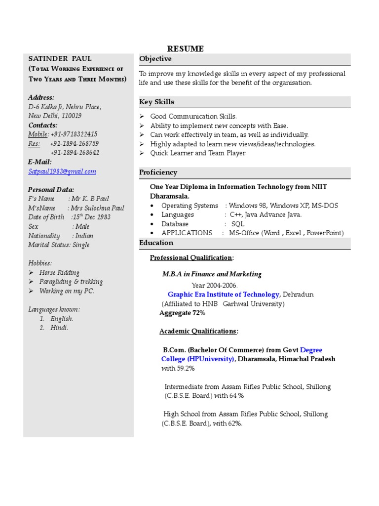 Personal Data: One Year Diploma in Information Technology from NIIT