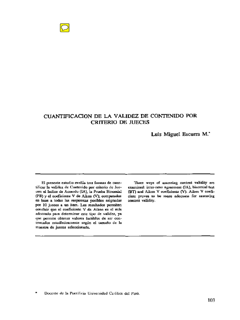 El presente estudio eva!ll !.re$ formas de cuantificar la validez de Cmtenido por criterio de Jueces: ellndice de Acuerdo (IA), la Prueba Binomial