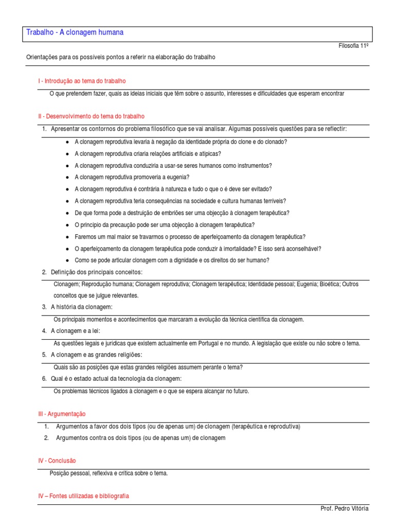 Clonagem; Reprodução humana; Clonagem reprodutiva; Clonagem terapêutica; Identidade pessoal; Eugenia; Bioética; Outros conceitos que se julgue relevantes.
