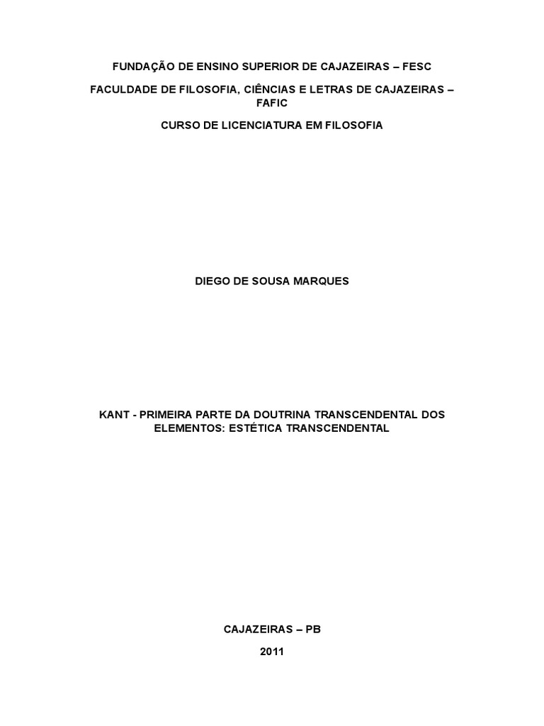 KANT - PRIMEIRA PARTE DA DOUTRINA TRANSCENDENTAL DOS