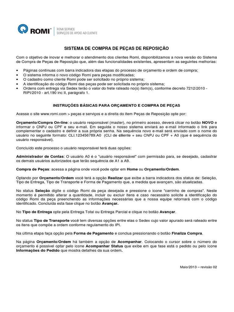 O cadastro como cliente Romi pode ser solicitado no prprio sistema;