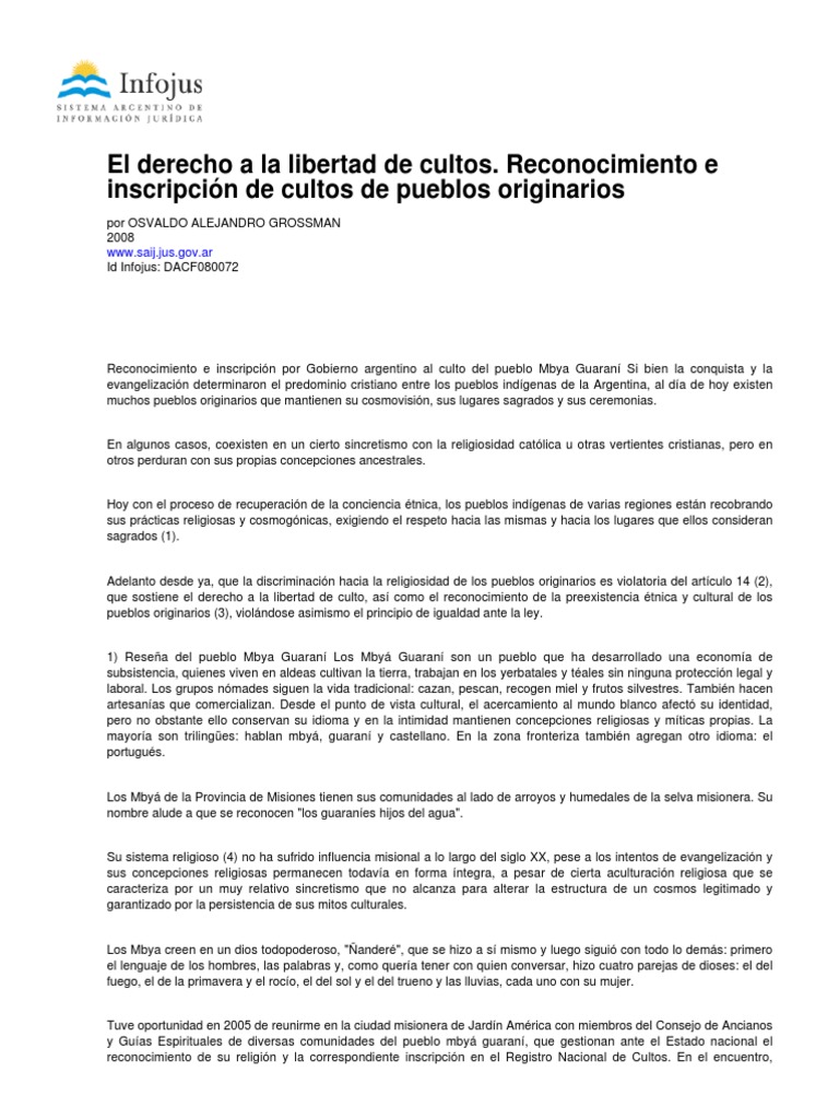 Reconocimiento e inscripcin por Gobierno argentino al culto del pueblo Mbya Guaran Si bien la conquista y la