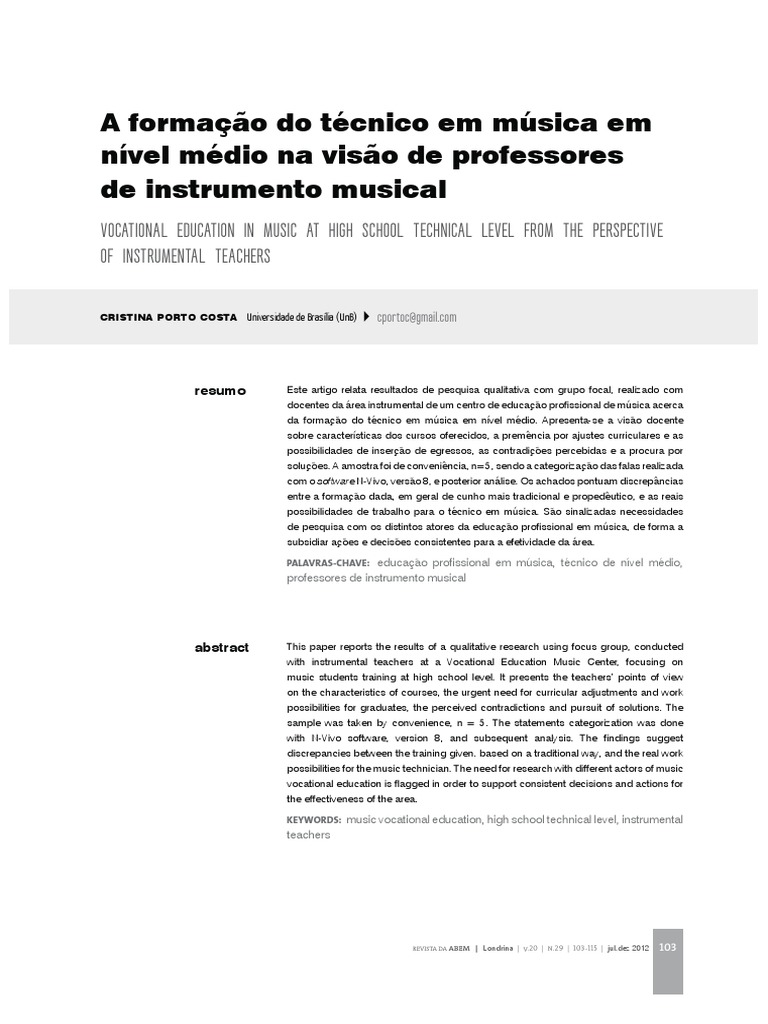This paper reports the results of a qualitative research using focus group, conducted with instrumental teachers at a Vocational Education Music Center, focusing on music students training at high school level. It presents the teachers’ points of view on the characteristics of courses, the urgent need for curricular adjustments and work possibilities for graduates, the perceived contradictions and pursuit of solutions. The sample was taken by convenience, n = 5. The statements categorization was done with N-Vivo software, version 8, and subsequent analysis. The findings suggest discrepancies between the training given. based on a traditional way, and the real work possibilities for the music technician. The need for research with different actors of music vocational education is flagged in order to support consistent decisions and actions for the effectiveness of the area.