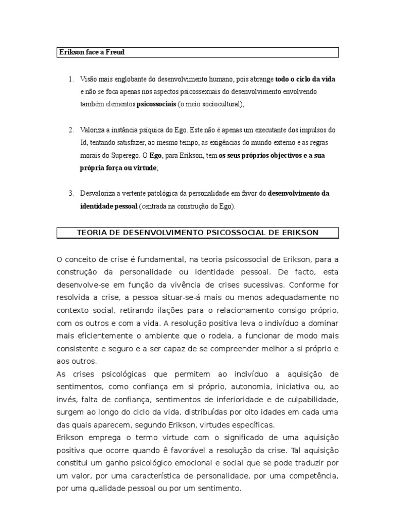 das quais aparecem, segundo Erikson, virtudes específicas.