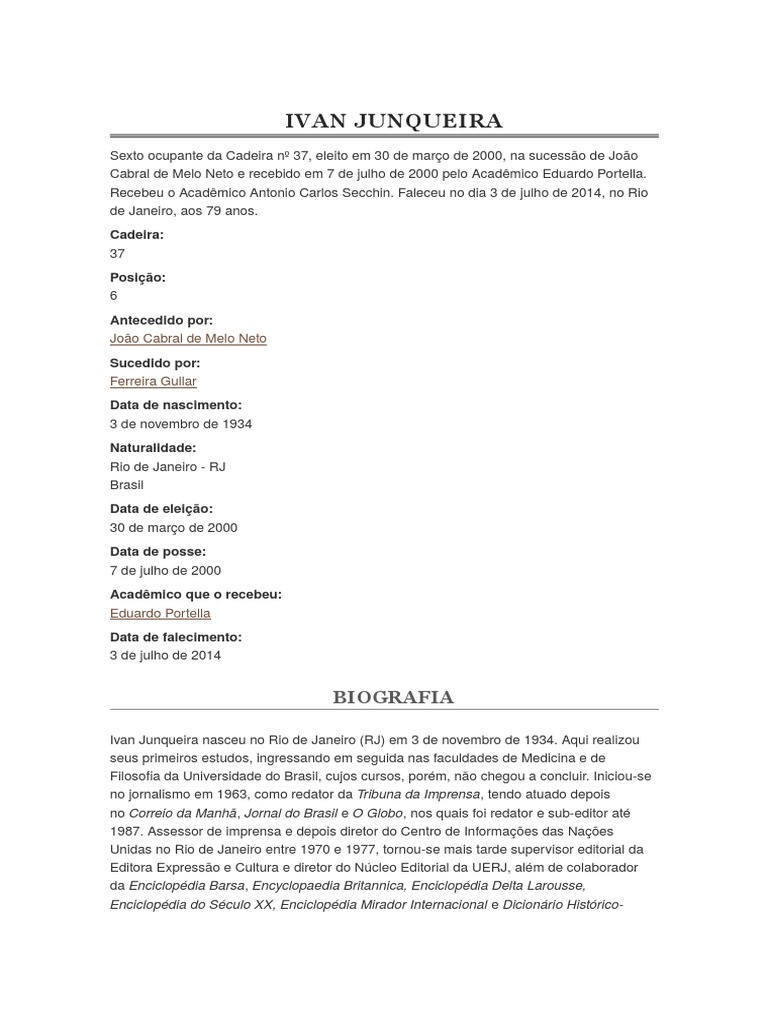 Ivan Junqueira nasceu no Rio de Janeiro (RJ) em 3 de novembro de 1934. Aqui realizou