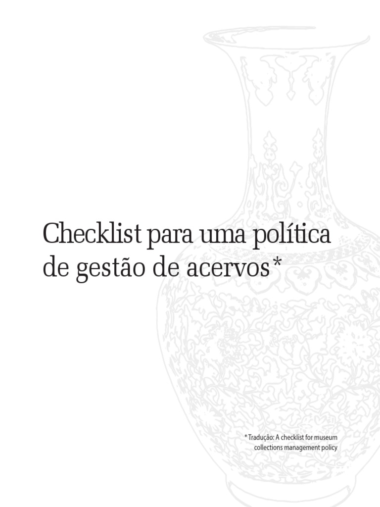 considerados na elaborao de uma Poltica de Gesto de Acervos voltada para museus histricoculturais e de arte. A lista apresenta apenas uma estrutura, ordem e contedo possveis para que se