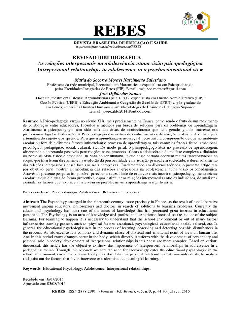 As relações interpessoais na adolescência numa visão psicopedagógica Interpersonal relationships in adolescence in a psychoeducational view