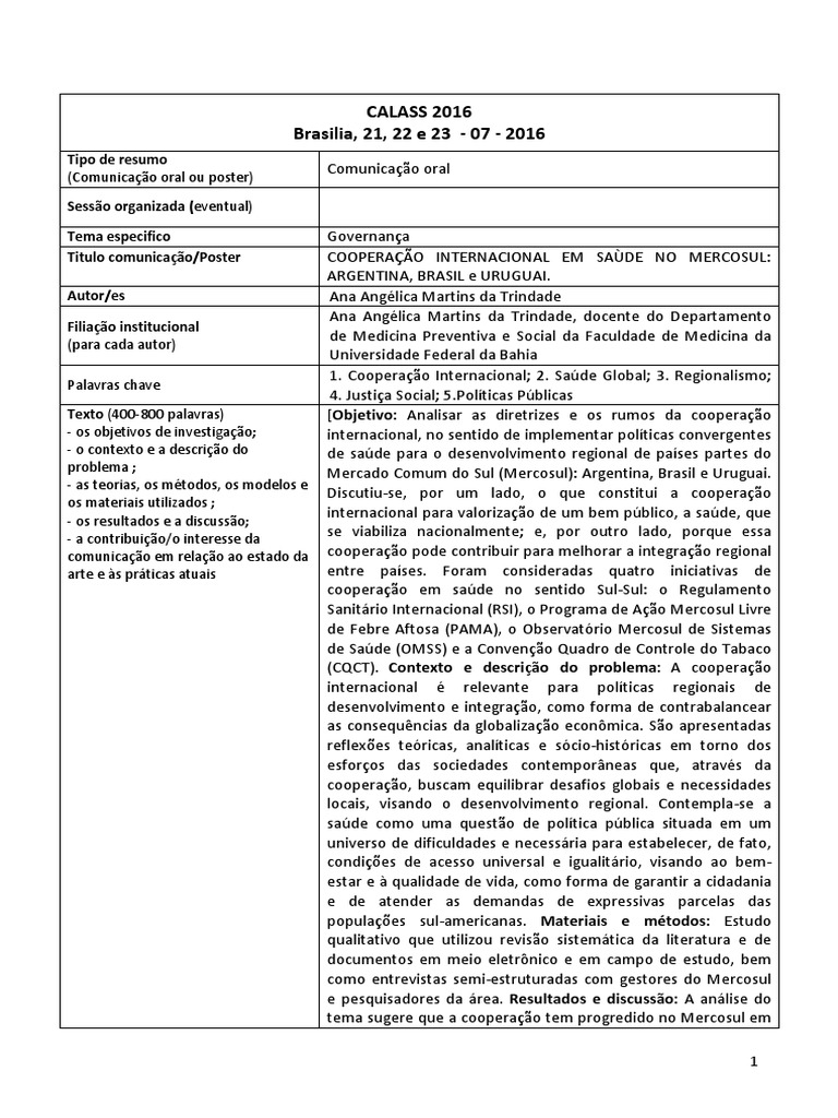 1. Cooperao Internacional; 2. Sade Global; 3. Regionalismo;