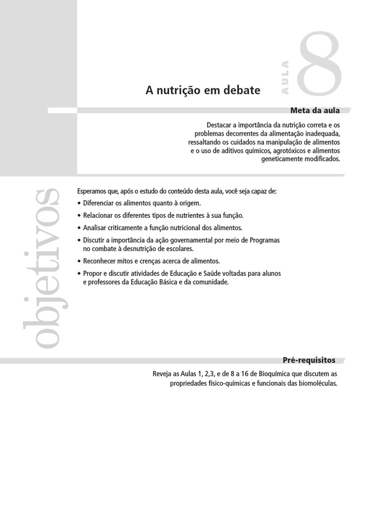 Nesta aula, discutiremos a importância da alimentação balanceada. Para tal, apresentaremos os nutrientes e suas funções. Algumas regras para a boa alimentação serão vistas, bem como algumas referentes à manipulação de alimentos. Questões atuais, como o debate sobre o uso de alimentos orgânicos, a utilização de agrotóxicos e os alimentos transgênicos, também terão lugar.