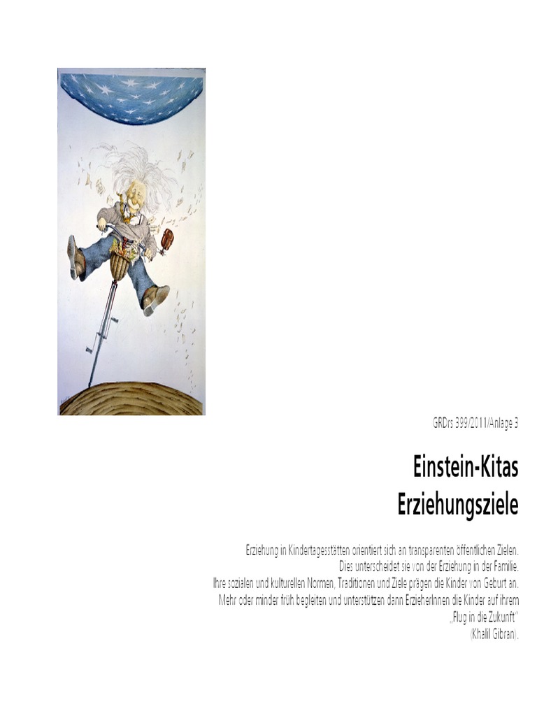 Der Sinn, nicht der Wortlaut der jeweiligen Zielformulierungen ist fr die Teams unserer Kitas verbindlich. Zu diesen nachfolgend genannten Erziehungszielen drfen letztendlich die persnlichen Erziehungsziele und die Erziehungsziele der Kita nicht im Widerspruch stehen.