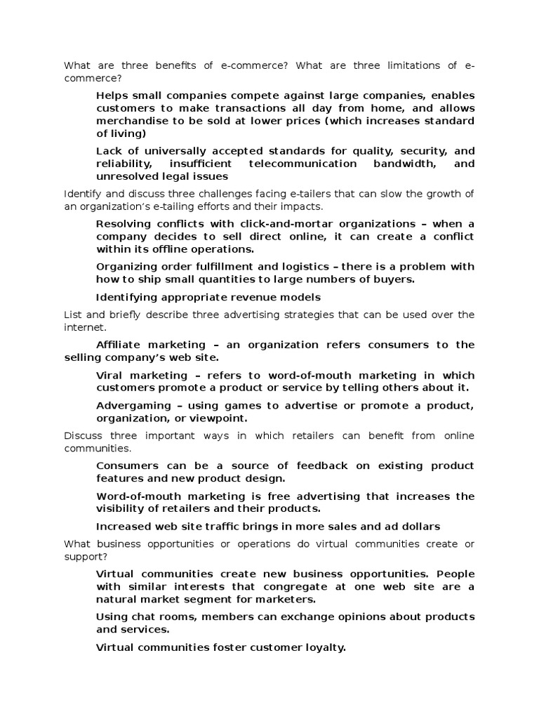 What are three benefits of e-commerce? What are three limitations of ecommerce?