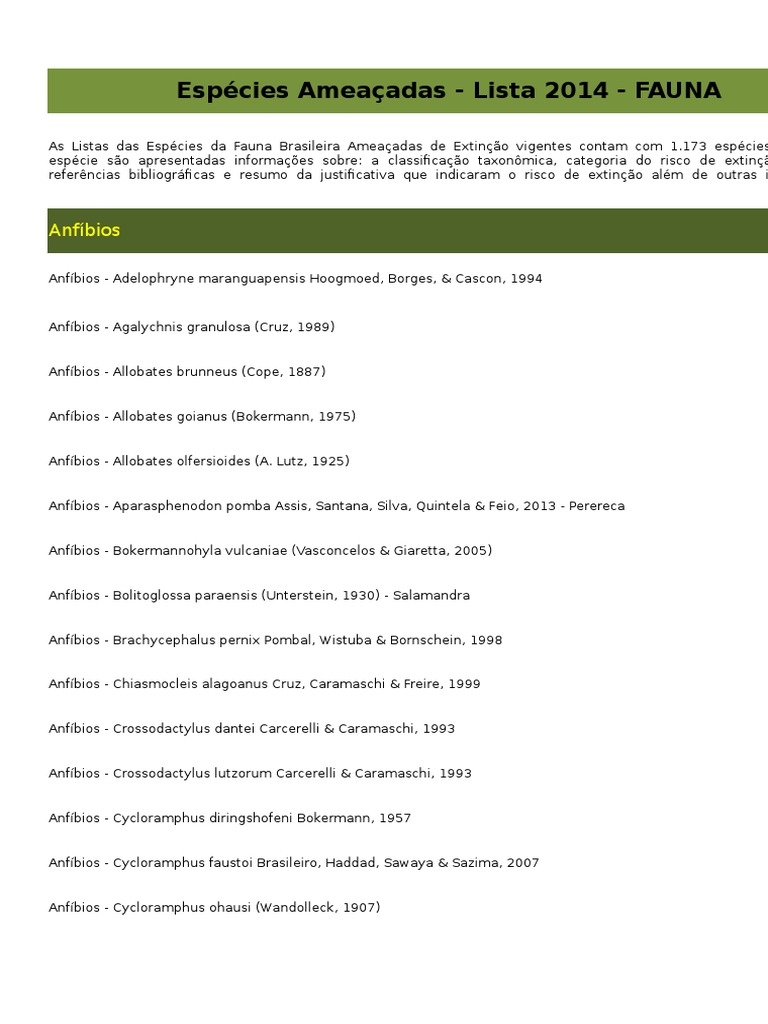 As Listas das Espcies da Fauna Brasileira Ameaadas de Extino vigentes contam com 1.173 espcies