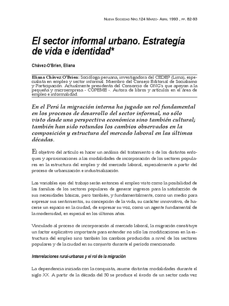 fuerza laboral, especialmente de las mujeres y los nios, que ante las escasas posibilidades de insercin en el sector moderno se incorporan al sector informal, y 4)