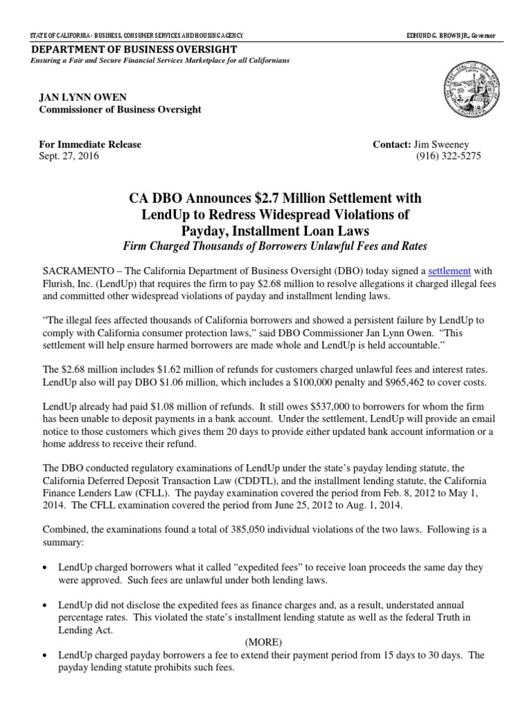 CA DBO Announces $2.7 Million Settlement with LendUp to Redress Widespread Violations of Payday, Installment Loan Laws
