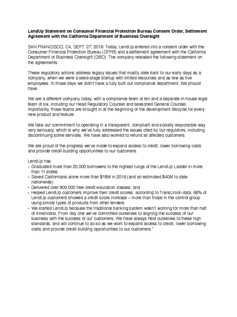 LendUp Statement on Consumer Financial Protection Bureau Consent Order, Settlement Agreement with the California Department of Business Oversight