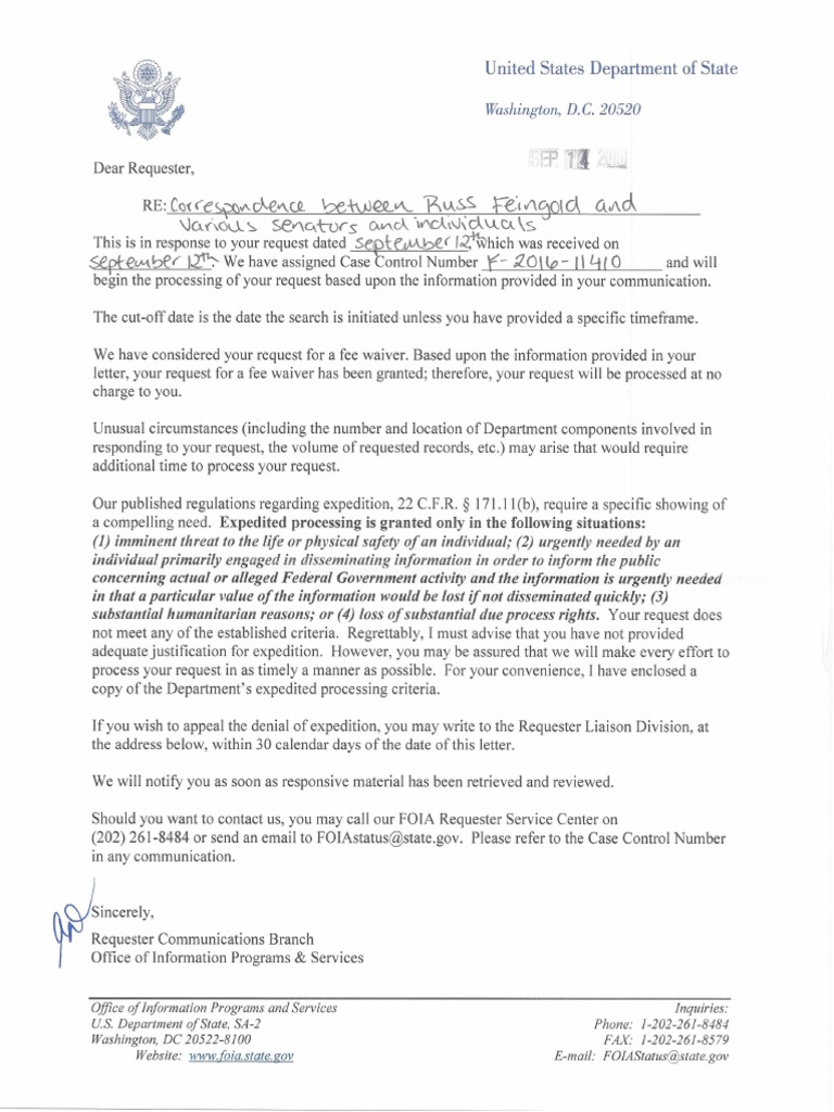 FOIA Appeal For Expedited Processing Of Russ Feingold State Department Correspondence