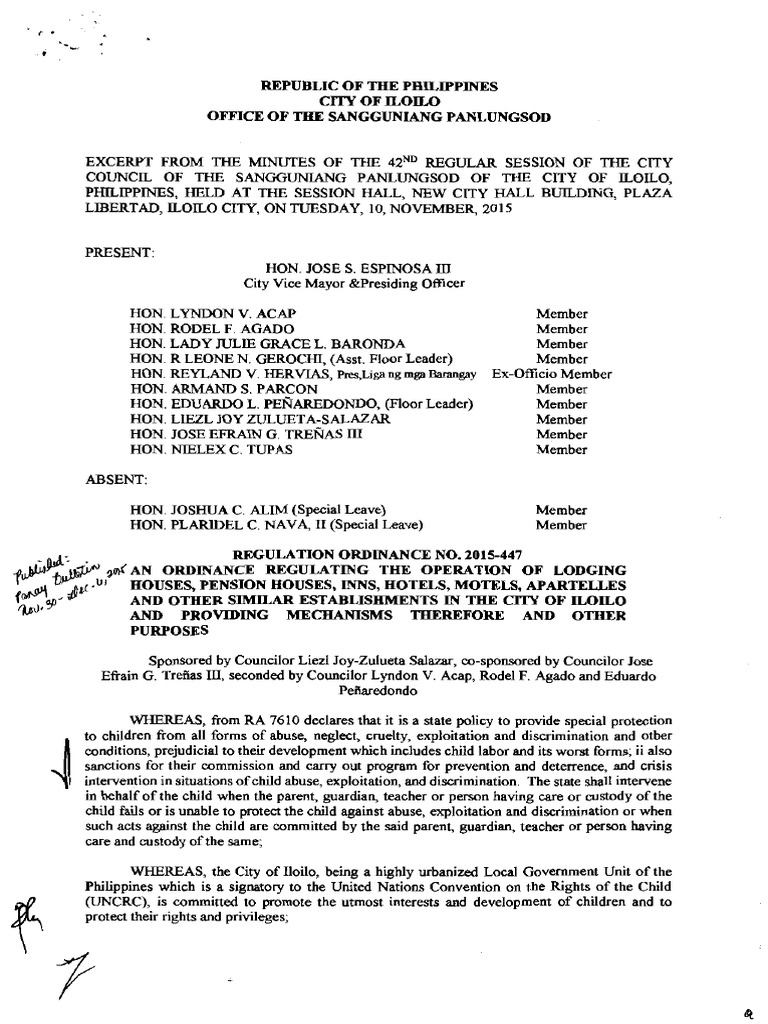 EXCERPT FROM THE MINUTES OF THE 42No REGULAR SESSION OF THE CITY COUNCIL OF THE SANGGUNIANG PANLUNGSOD OF THE CITY OF ILOILO, PHILIPPINES, HELD AT THE SESSION HALL, NEW CITY HALL BUILDING, PLAZA LIBERT AD, ILOILO CITY, ON TUESDAY, 10, NOVEMBER, 2015