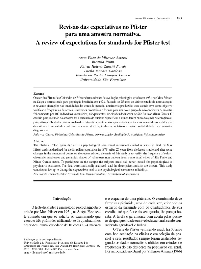 Key-words: Pfisters Color Pyramids test; Standardization; Psychological assessment