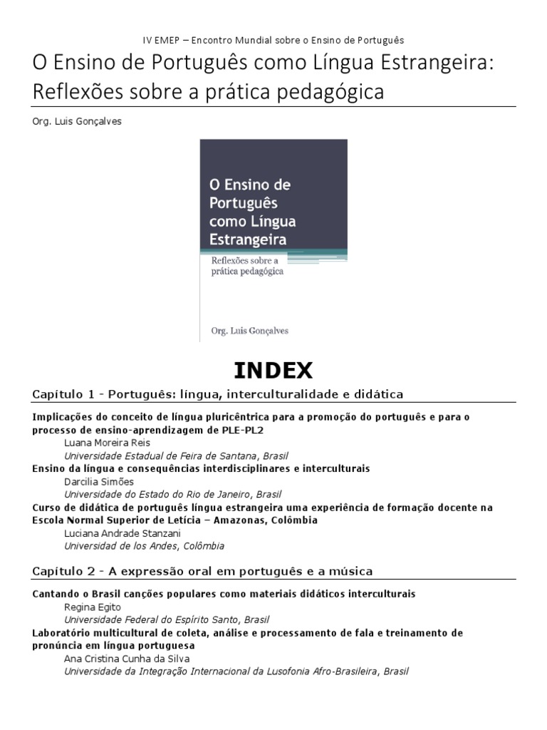 Implicações do conceito de língua pluricêntrica para a promoção do português e para o processo de ensino-aprendizagem de PLE-PL2 Luana Moreira Reis Universidade Estadual de Feira de Santana, Brasil Ensino da língua e consequências interdisciplinares e interculturais Darcilia Simões Universidade do Estado do Rio de Janeiro, Brasil Curso de didática de português língua estrangeira uma experiência de formação docente na Escola Normal Superior de Letícia – Amazonas, Colômbia Luciana Andrade Stanzani Universidad de los Andes, Colômbia