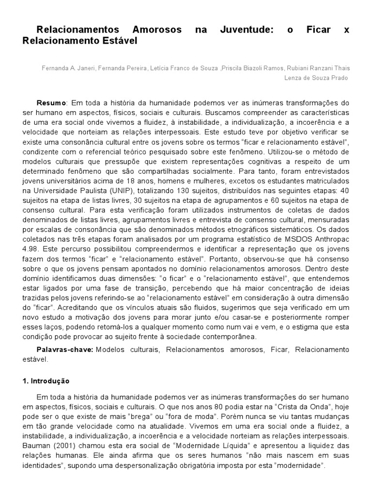 Justo (2005) em O ficar na adolescncia e paradigmas de relacionamento amoroso cita que