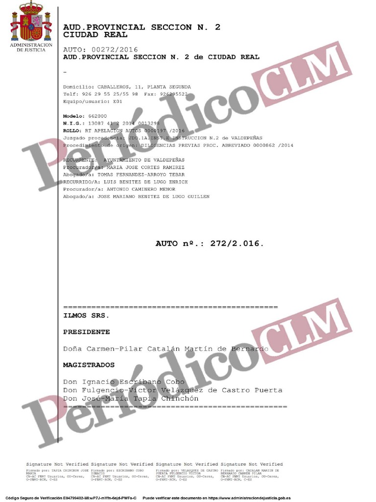 Auto en el que Inda admite que se inventó la condena contra Benítez de Lugo
