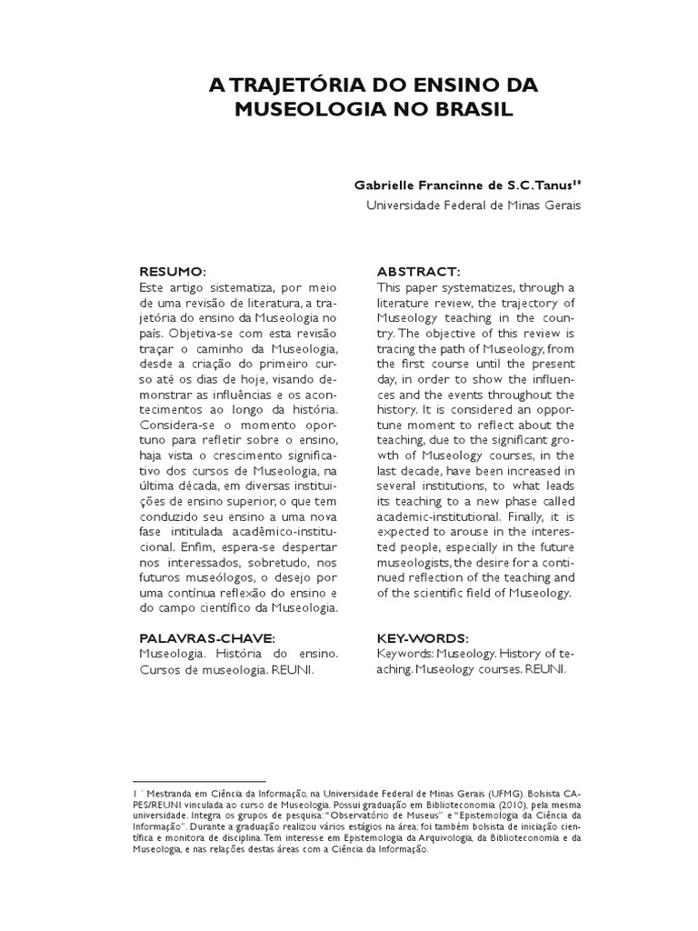 tem como objetivo perfazer, a partir de uma revisão de literatura, a trajetória do en- sino da Museologia no país, desde o primeiro curso de Museologia, o Curso de Mu- seus, até a configuração do novo cenário do ensino, em que se apresentam 14 cursos regulares de Museologia em funcionamento em todo o país, e um curso vinculado a Faculdade Dom Bosco de Monte Aprazível (FAECA/SP), que está cadastrado no site do Ministério da Educação (E-MEC), mas ainda não iniciou suas atividades. Portanto, considera-se este momento oportuno para reflexão da trajetória do ensino da Museologia, visando demonstrar suas influências e acontecimentos que marcaram o percurso desses cursos.Acredita-se que,com essa recente configuração dos cursos de Museologia vinculados a institutos, escolas e departamentos diferentes, delineia-se uma nova fase no ensino da Museologia, que pode ser intitulada como fase acadêmico-institucional.Essa nova fase decorre em virtude das diferentes vinculações dos cursos, bem como pela proximidade institucional, em especial, com os cursos de Biblioteconomia e os de Arquivologia2. Espera-se também que, além dessa pesquisa histórica, este trabalho desperte, sobretudo, em todos aqueles interessados a impor- tância de manter uma reflexão contínua sobre o ensino e o campo da Museologia.