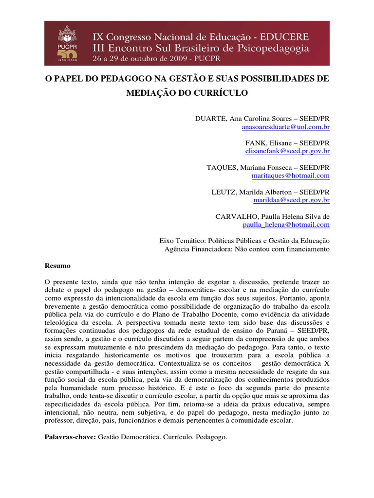 Palavras-chave: Gesto Democrtica. Currculo. Pedagogo.