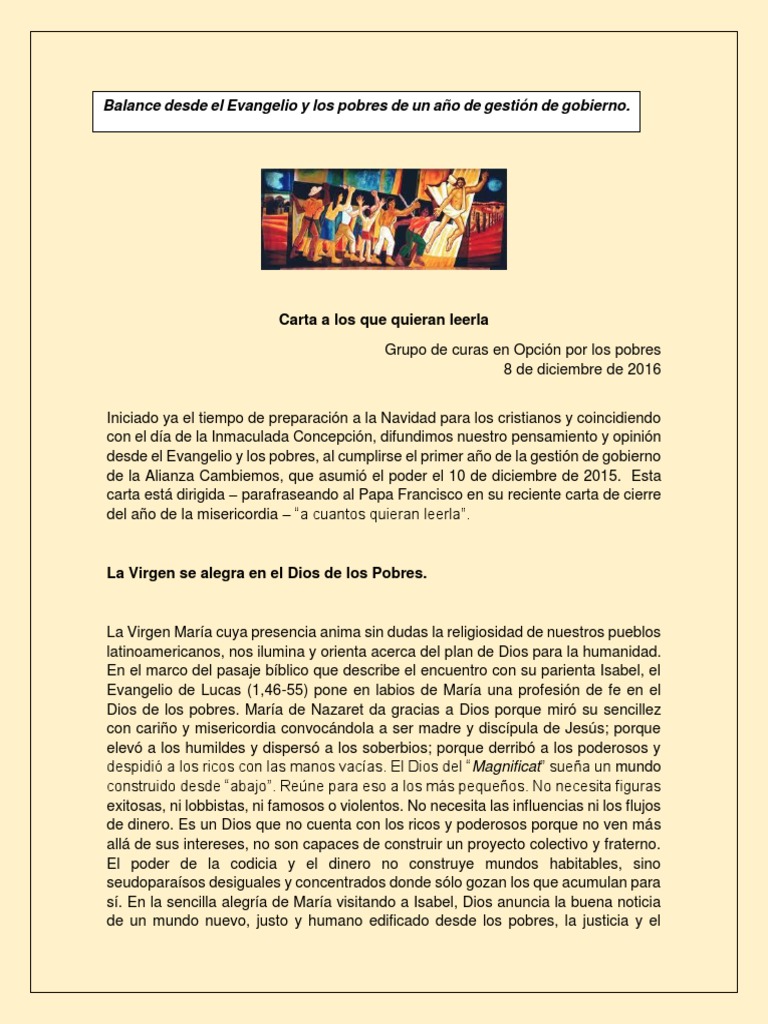 desde el Evangelio y los pobres, al cumplirse el primer ao de la gestin de gobierno