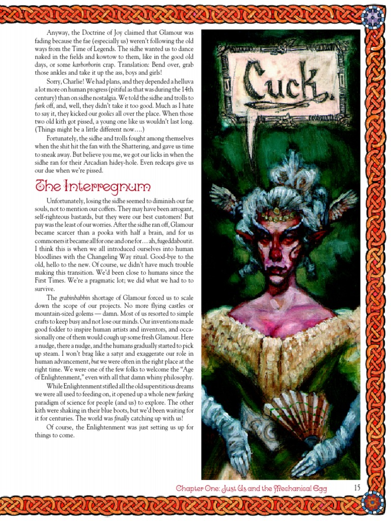 griping now because Dray and those Parliament of Dreams pea-brains are breathing down their necks. Everyone knows the trolls and the sidhe are two peas in a pod. It mashes my nads when they try to deny it! Overseas, the sidhe tried to carve up the British Isles into little kingdoms during the War of Ivy. This time, things went a little differently, we fared a bit better, and now that the smoke’s cleared, nockers’re sitting on thrones in two kingdoms! There’s Lord Davey in the Kingdom of Smoke, and King Morwyd rules the Mistlands during the winter. Hot damn — some respect for once! As for the Arcadian nockers who arrived with the sidhe, they went underground after the war — fast. They’ve sent only a few samples of their work to our Bes Din patent offices. I’ve seen some of it, and I will admit that they’ve improved on their admirable crafting abilities, and I will leave it at that. You need them ears, friend, and what I could say might not do ‘em much good.