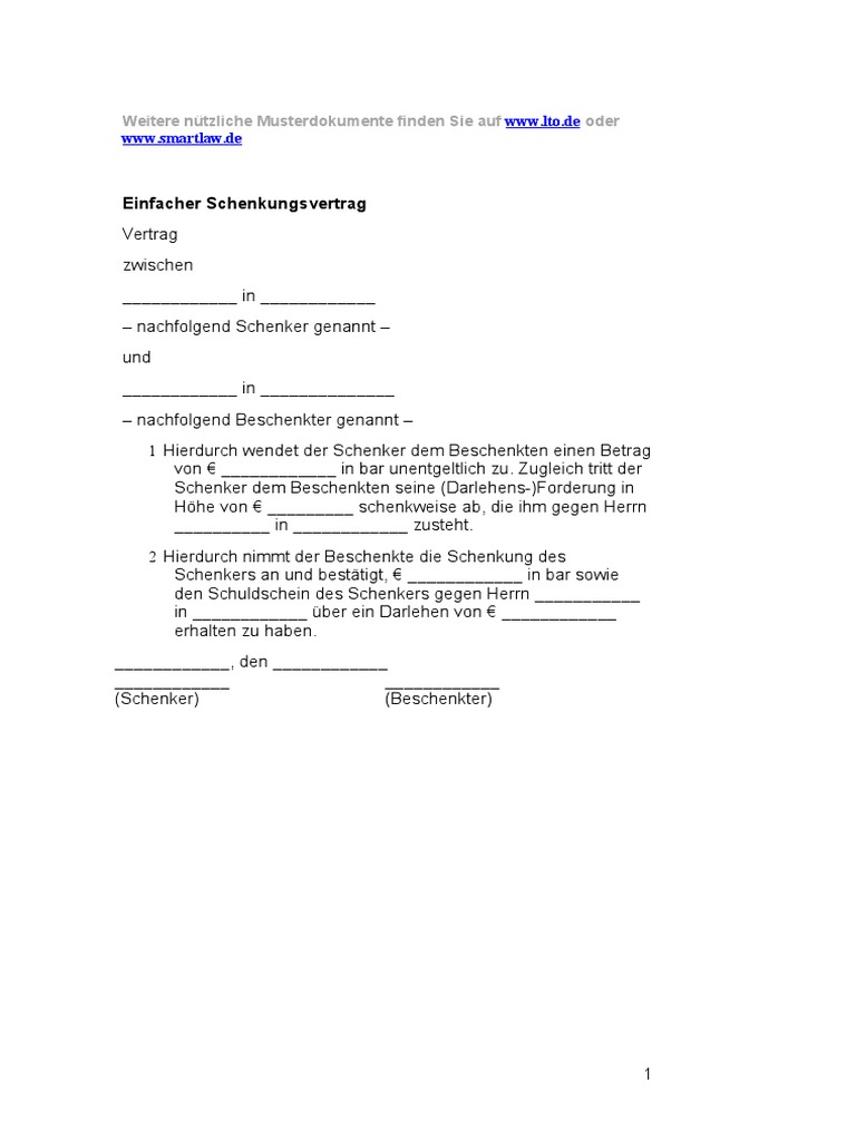 1 Hierdurch wendet der Schenker dem Beschenkten einen Betrag