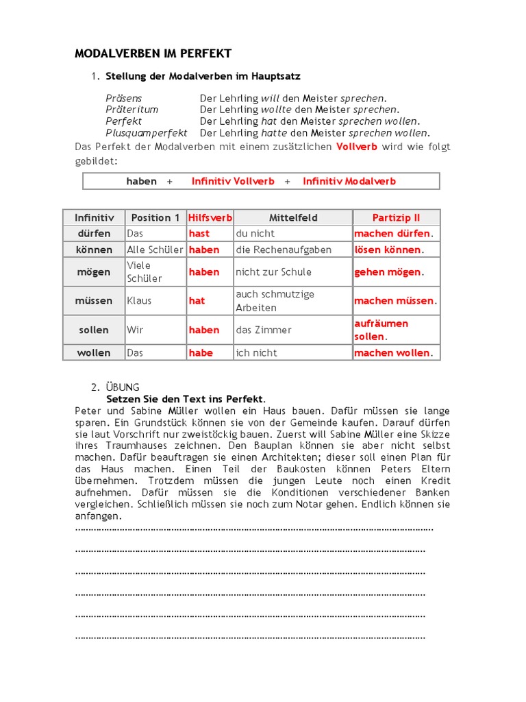 Das Perfekt der Modalverben mit einem zustzlichen Vollverb wird wie folgt