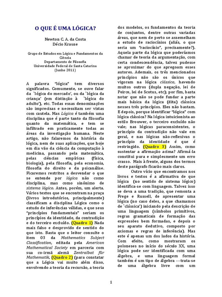 A! palavra! “lógica”! tem! diversos! significados.! Comumente,! se! ouve! falar! da!!`lógica!do!mercado’,!ou!da!`lógica!da! criança’! (em! distinção! à! ! `lógica! do! adulto’),!etc.!Todas!essas! denominações! são! imprecisas! e! necessitam! ser! vistas! com!cautela.!Mas! Lógica!é! também!uma! disciplina! que! é! parte! tanto! da! filosofia! quanto! d a! matemática,! e! tem! se! infiltrado! em! praticamente! todas! as! áreas! da! investigação! humana.! Neste! artigo,! não! falaremos! da! história! da! lógica,!nem!de!suas!aplicações,!que!hoje! em! dia! vão! da! ciência! da! computação! à! medicina,! passando! pela! matemática,! pelas! ciências! empíricas! (física ,! biologia), ! pela! filosofia,! pela! economia,! filosofia! do! direito! e! da! psicanálise.! Ficaremos! restritos! a! desvendar! o! que! se! entende! por! lógica! não! como! disciplina,! mas! como! sinônimo! de! sistema,lógico .! Antes,! porém,! um! alerta.! Vários! textos!que!se!encontra m !na!praça! (livros! introdutórios,! principalmente)! classificam ! a! disciplina! Lógica! como! o! estudo!de!inferências!válidas,!e!que!seus! “princípios! fundamentais”! seriam! os! princípios!da!identidade,!da!contradição!