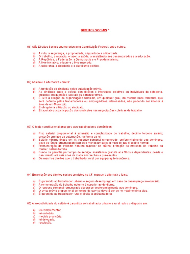 04) Em relao aos direitos sociais previstos na CF, marque a alternativa falsa: