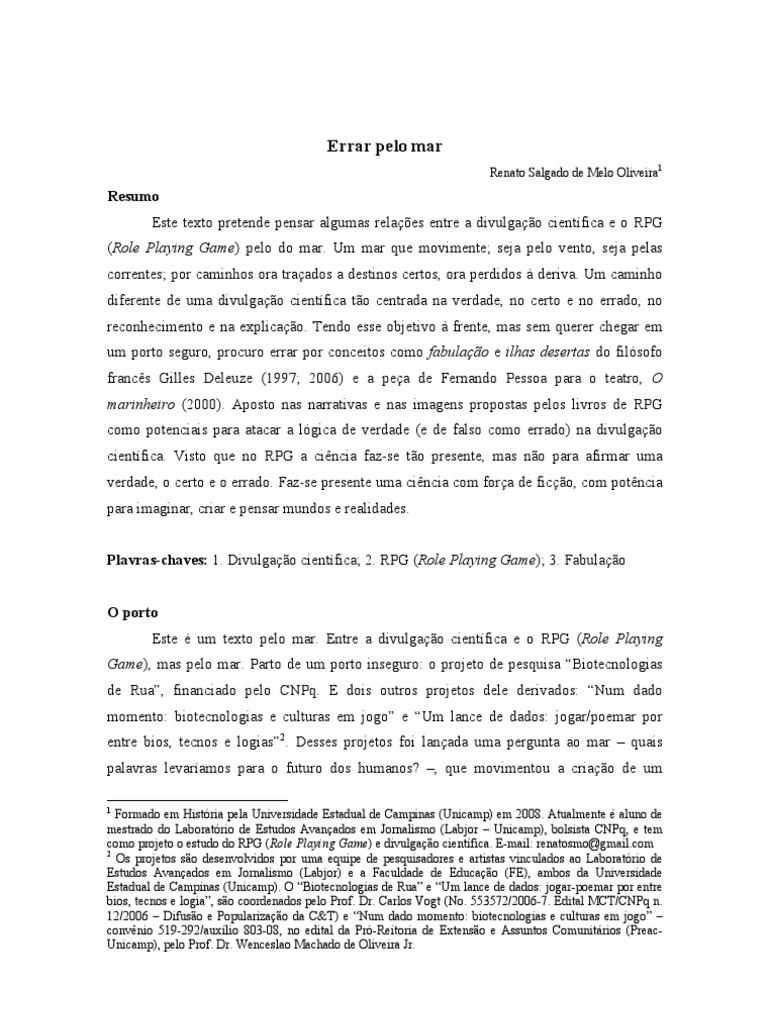 1 Formado em História pela Universidade Estadual de Campinas (Unicamp) em 2008. Atualmente é aluno de mestrado do Laboratório de Estudos Avançados em Jornalismo (Labjor – Unicamp), bolsista CNPq, e tem como projeto o estudo do RPG (Role Playing Game) e divulgação científica. E-mail: renatosmo@gmail.com
