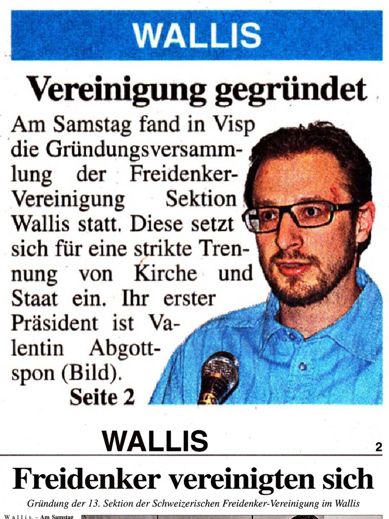 Am Samstag fand in Visp die Oründungsversammlung der FreidenkerVereinigung Sektion Wallis statt. Diese setzt