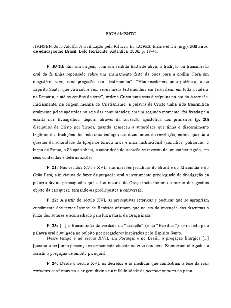 HANSEN, Joo Adolfo. A civilizao pela Palavra. In: LOPES, Eliane et alli (org.). 500 anos