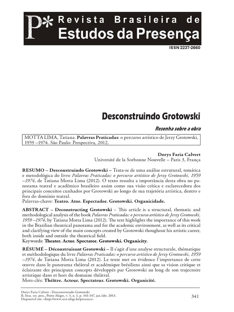 RÉSUMÉ – Déconstruisant Grotowski – Il s’agit d’une analyse structurale, thématique et méthodologique du livre Palavras Praticadas: o percurso artístico de Jerzy Grotowski, 1959 –1974, de Tatiana Motta Lima (2012). Le texte met en évidence l’importance de cette œuvre dans le panorama théâtral et académique brésiliens ainsi que sa vision critique et éclairante des principaux concepts développés par Grotowski au long de son trajectoire artistique dans et hors du domaine théâtral. Mots-clés: Théâtre. Acteur. Spectateur. Grotowski. Organicité.