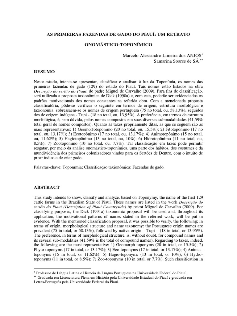 Palavras-chave: Toponmia; Classificao taxionmica; Fazendas de gado.