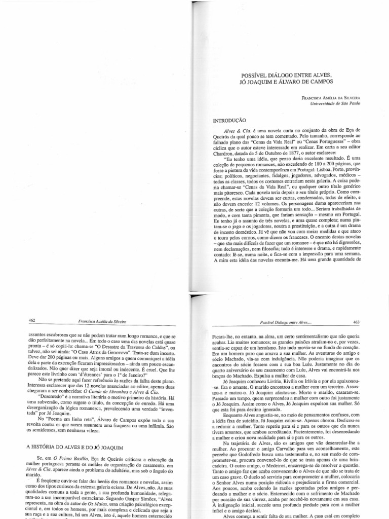 A autora equaciona o jogo de relações entre as personagens Godofredo Alves e Jó Joaquim de Alves & Companhia, relacionando-as com "Poema em linha reta" de Álvaro de Campos.