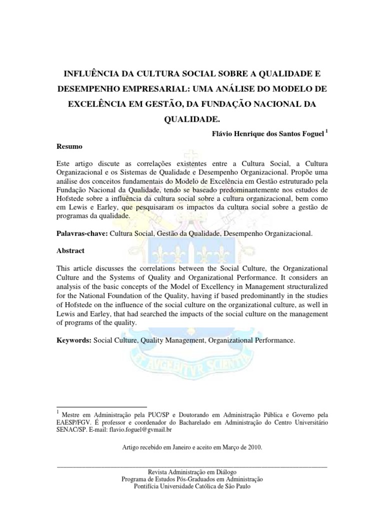 INFLUÊNCIA DA CULTURA SOCIAL SOBRE A QUALIDADE E DESEMPENHO EMPRESARIAL: UMA ANÁLISE DO MODELO DE EXCELÊNCIA EM GESTÃO, DA FUNDAÇÃO NACIONAL DA QUALIDADE.