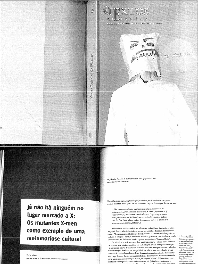 [...] Os primeiros geneticistas recorriam à palavra monstros e não ao termo mutantes. No entanto, para esta área científica em particular, tal evento biológico - a mutação - é real e nada reserva de fantástico, existindo toda uma tipologia de causas balizadas, de estratificações de efeitos, de tranquilidade em relação ao seu significado. Quero falar-vos, de um modo totalmente livre, de um classe muito particular de mutantes: a do grupo de super-heróis, personagens fictícias do mainstream da banda desenhada norte-americana, conhecida por X-men... ".