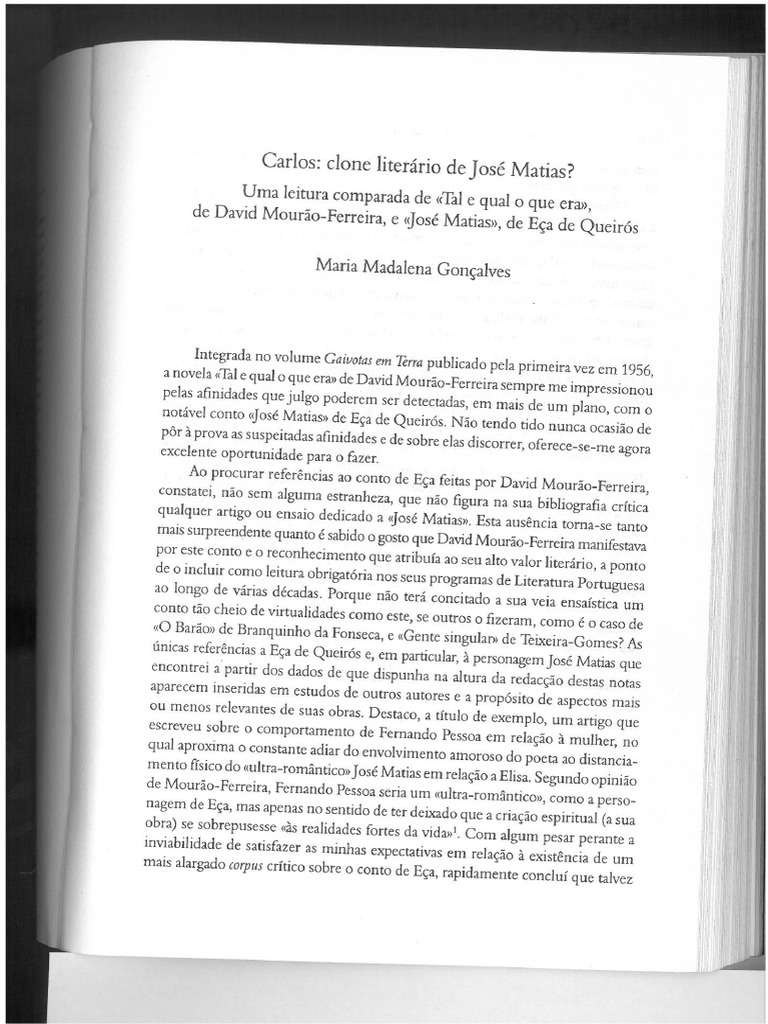"Integrada no volume Gaivotas em Terra publicado pela primeira vez em 1956, a novela «Tal e qual o que era» de David Mourão-Ferreira sempre me impressionou pelas afinidades que julgo poderem ser detetadas, em mais de um plano, com o notável conto «José Matias» de Eça de Queirós."